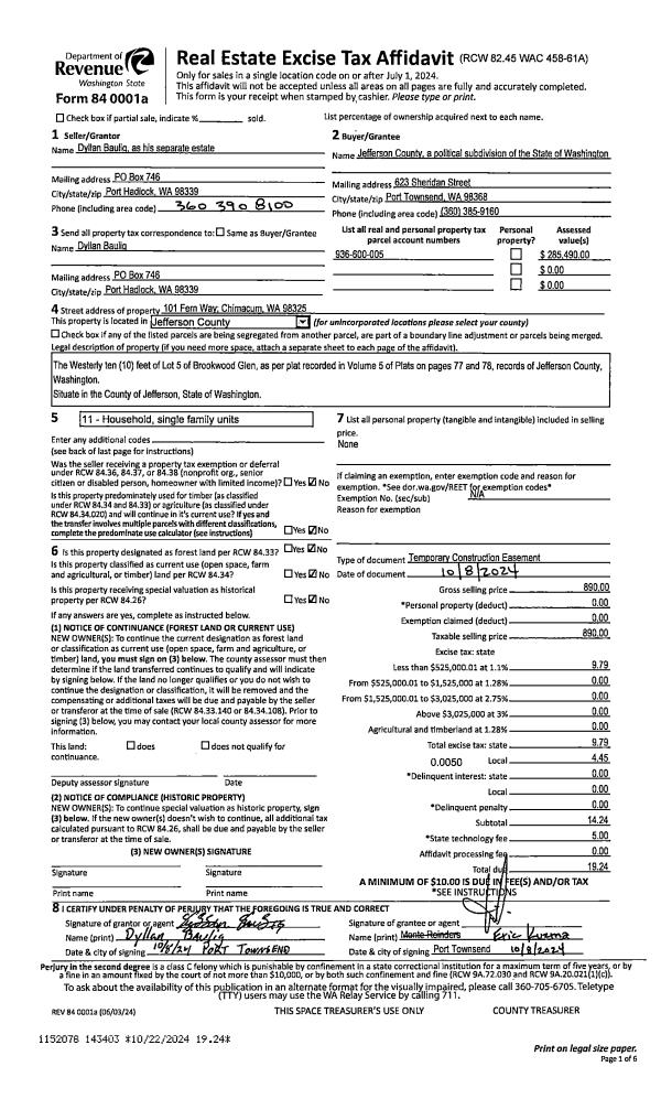 | 1 | 10/08/2024 | EASE | Assignment of Easement | DYLLAN BAULIG | JEFFERSON COUNTY | | | $890.00 | 143403 | TEMP CONST EASE |