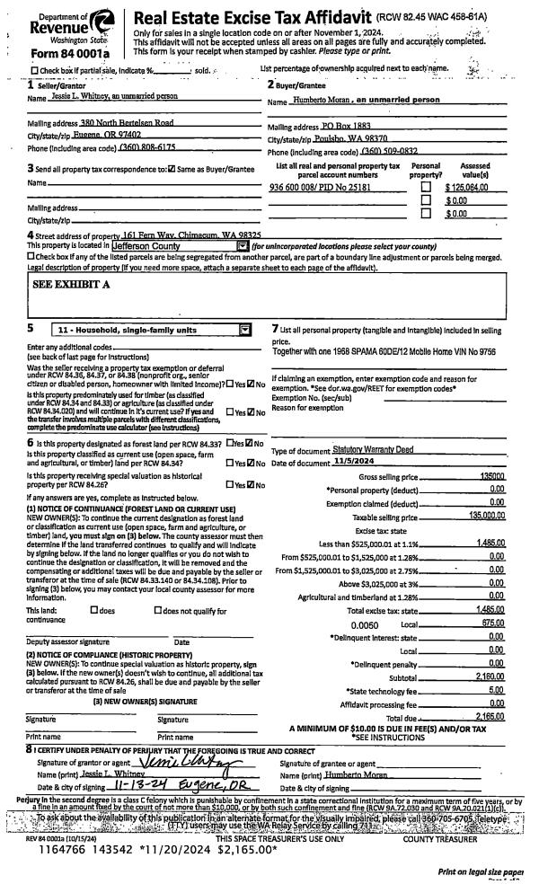 | 2 | 11/05/2024 | SWD | Statutory Warranty Deed | JESSIE L WHITNEY | HUMBERTO MORAN | | | $135,000.00 | 143542 | |