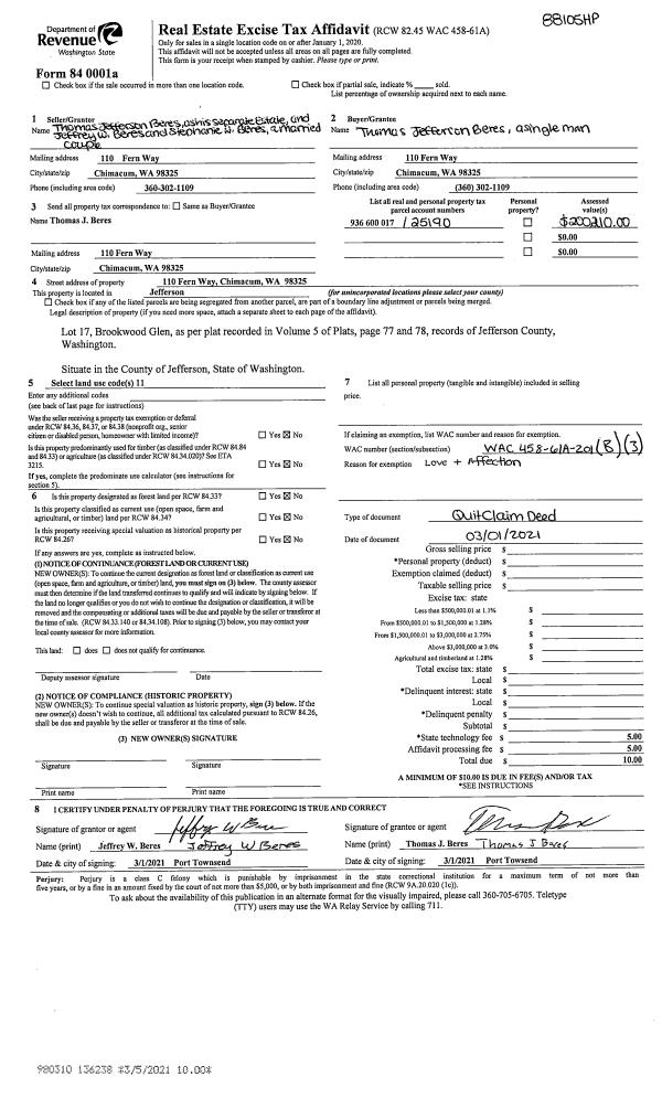 | 1 | 03/01/2021 | QCD | Quit Claim Deed | THOMAS J BERES | THOMAS J BERES | | | | 136238 | |