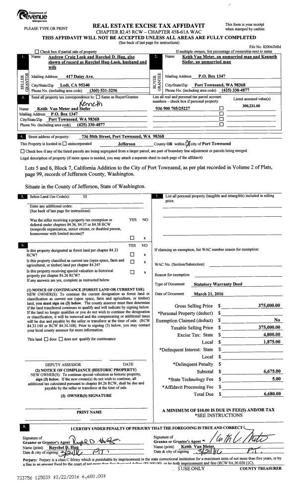 | 4 | 03/21/2016 | SWD | Statutory Warranty Deed | ANDREW C LUSK | KEITH VAN METER JTWROS | | | $375,000.00 | 125039 | |