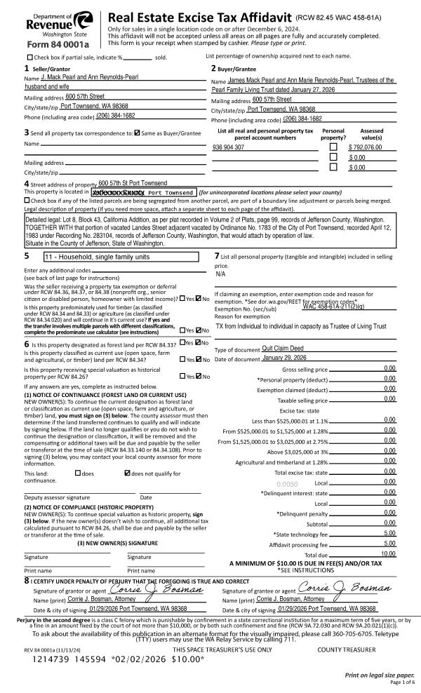 | 1 | 01/29/2026 | QCD | Quit Claim Deed | J MACK & ANN R PEARL | PEARL FAMILY LIVING TRUST | | | | 145594 | |