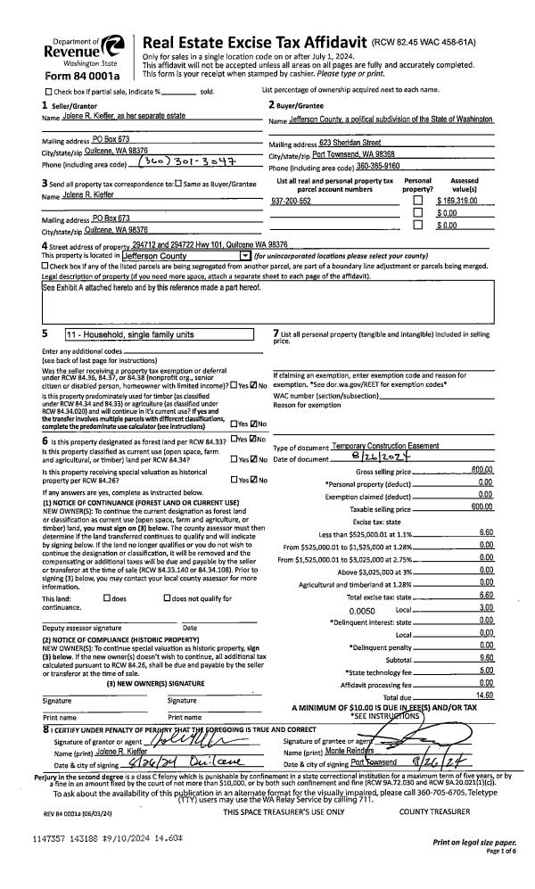 | 1 | 08/26/2024 | EASE | Assignment of Easement | ROBERT L KIEFFER | JEFFERSON COUNTY | | | $600.00 | 143188 | TEMP EASE |