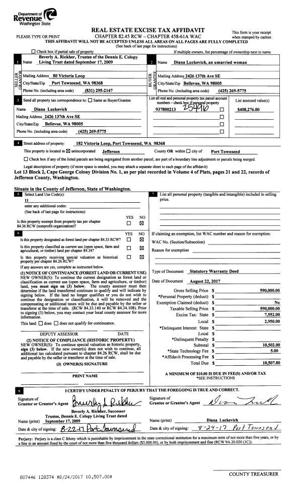 | 1 | 08/22/2017 | SWD | Statutory Warranty Deed | DENNIS COLOPY LIVING TRUST | DIANA LUCKEVICH | | | $590,000.00 | 128374 | |