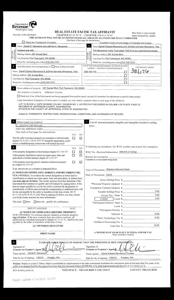 | 1 | 07/02/2015 | SWD | Statutory Warranty Deed | DANIEL E NIEUWSMA | NIEUWSMA LIVING TRUST | | | | 123484 | |