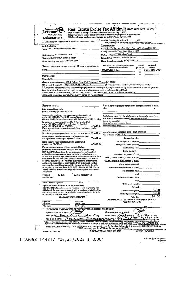 | 1 | 05/01/2025 | QCD | Quit Claim Deed | SCOT D & GRACIELA BARR | BARR FAMILY REVOCABLE TRUST | | | | 144317 | |