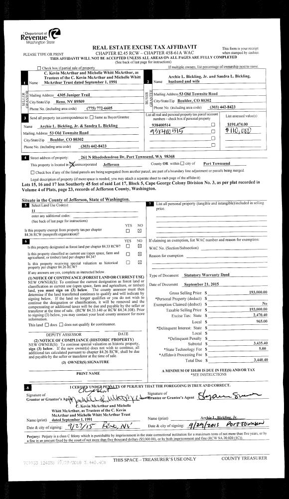 | 1 | 09/21/2015 | SWD | Statutory Warranty Deed | CHARLES KEVIN MCARTHUR TRSTE | SANDRA & ARCHIE JR BICKLING | | | $193,000.00 | 124058 | |