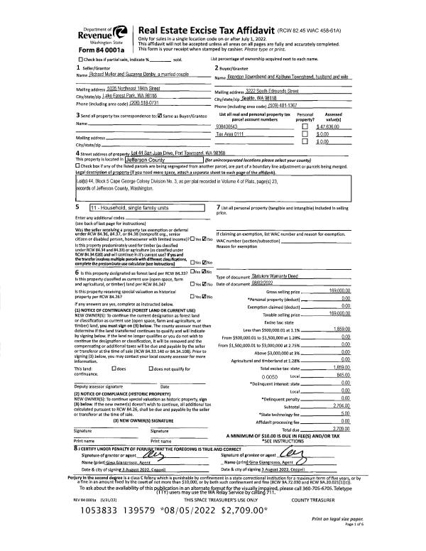 | 1 | 08/02/2022 | SWD | Statutory Warranty Deed | RICHARD MULLER & SUZANNE DENBY | BRENDON & KAITLYNN TOWNSHEND | | | $169,000.00 | 139579 | |