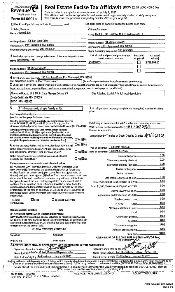 | Mailing Address: | MARK L LOTT 91 MARINE VIEW PL PORT TOWNSEND, WA 98368-9424 | % Ownership: | 100.0000000000% |
