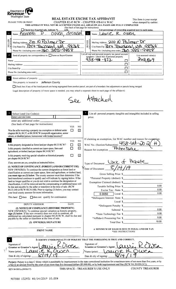 | 2 | 08/14/2019 | LOP | Lack of Probate | KENNETH D OWEN | LAURIE R OWEN | | | | 132931 | |