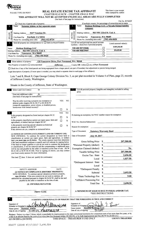 | 3 | 07/10/2017 | SWD | Statutory Warranty Deed | SUZANNE ATKINS | HOLDEM HOLDINGS LLC | | | $207,500.00 | 128148 | |