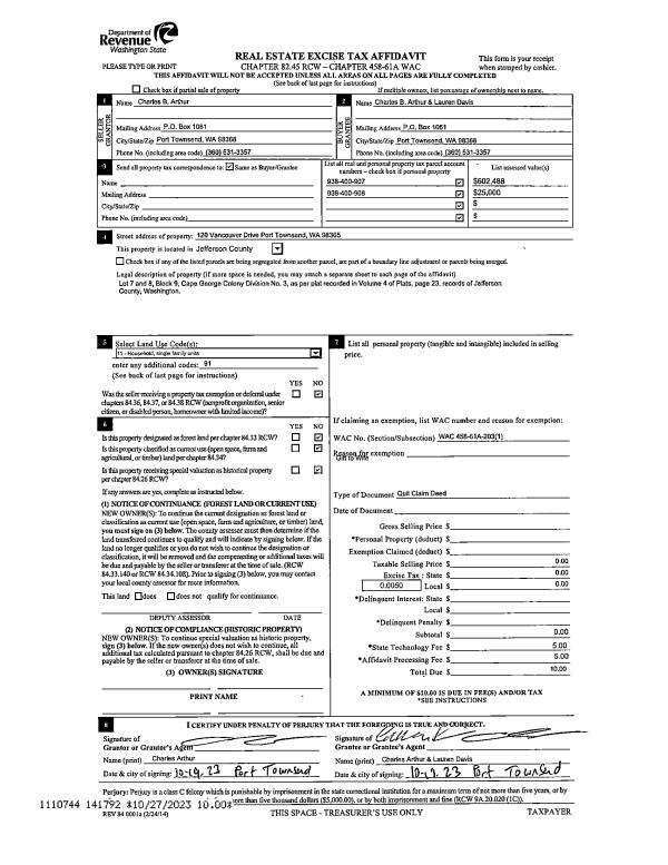 | 1 | 10/27/2023 | QCD | Quit Claim Deed | CHARLES B ARTHUR | CHARLES B ARTHUR | | | | 141792 | |