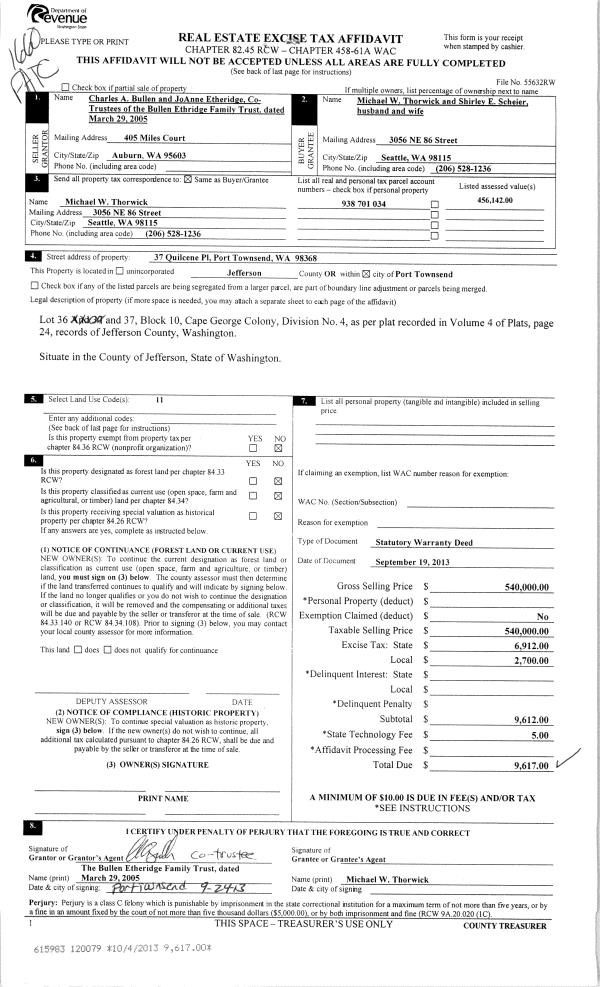 | 1 | 09/19/2013 | SWD | Statutory Warranty Deed | BULLEN ETHERIDGE FAMILY TRUST | MICHAEL THORWICK & SHIRLEY SCHEIER | | | $540,000.00 | 120079 | |