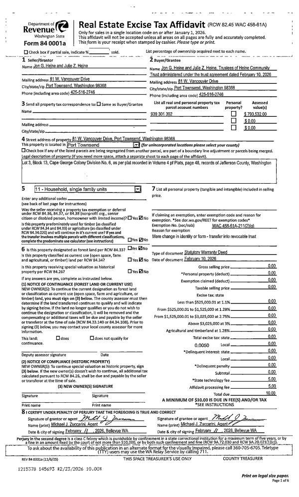 | 1 | 02/10/2026 | SWD | Statutory Warranty Deed | JON G & JULIE Z HEINE | HEINE COMMUNITY TRUST | | | | 145693 | |