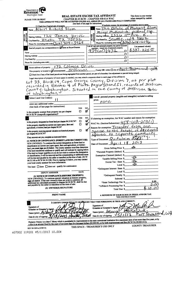 | 1 | 08/07/2013 | SWD | Statutory Warranty Deed | MARGARET A ELAM | PHILIP SPARKS & ROSEMARY SWEENEY | | | $430,000.00 | 119793 | |