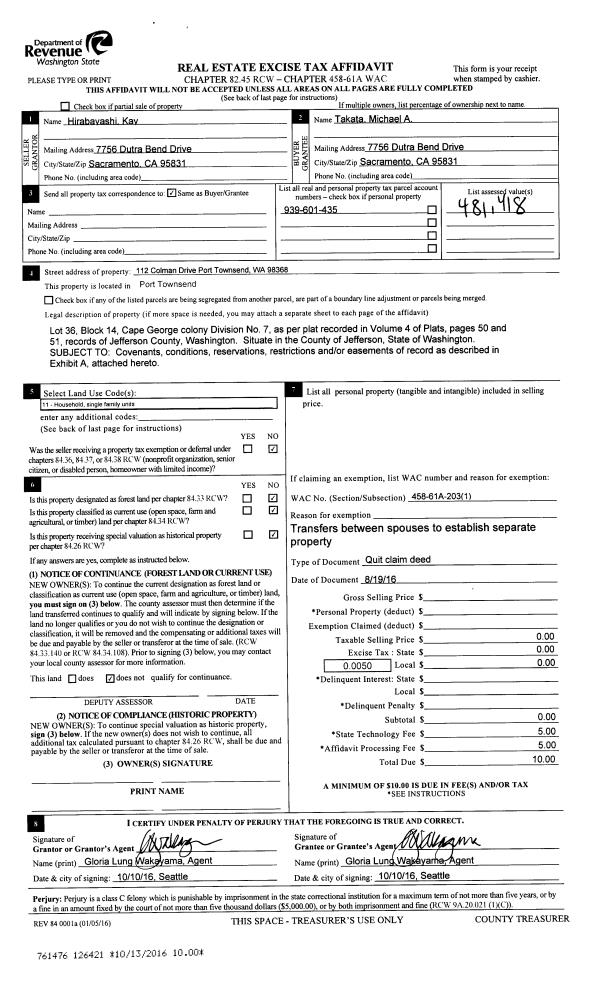 | 3 | 09/30/2016 | SWD | Statutory Warranty Deed | HARRY H TAKATA TRUSTEE | MICHAEL A TAKATA | | | $260,000.00 | 126420 | |