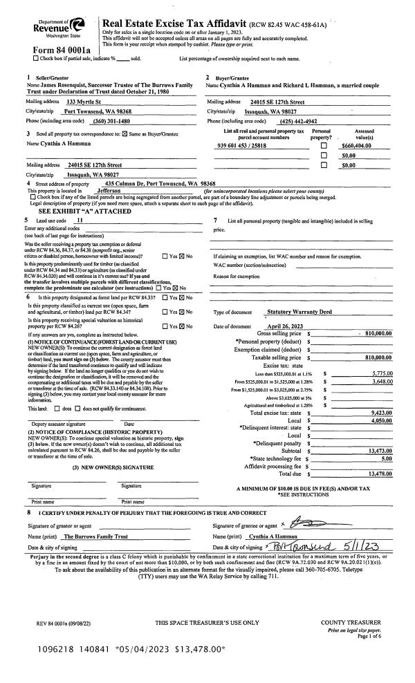 | 1 | 04/26/2023 | SWD | Statutory Warranty Deed | WALTER E BURROWS TRUSTE | RICHARD L & CYNTHIA A HAMMAN | | | $810,000.00 | 140841 | |