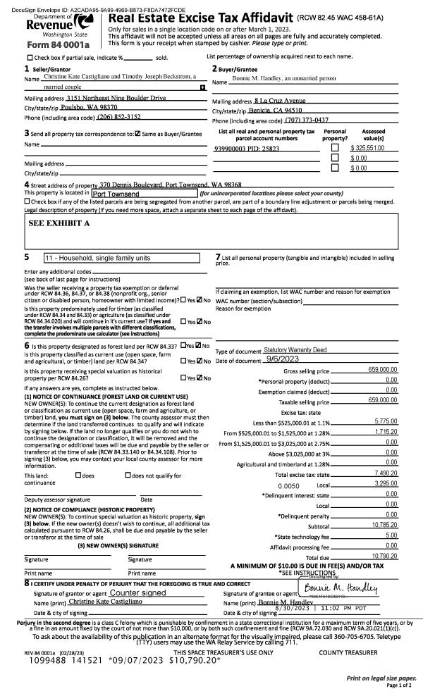 | 1 | 09/06/2023 | SWD | Statutory Warranty Deed | CHRISTINE CASTIGLIANO & TIMOTHY BECKSTROM | BONNIE M HANDLEY | | | $659,000.00 | 141521 | |