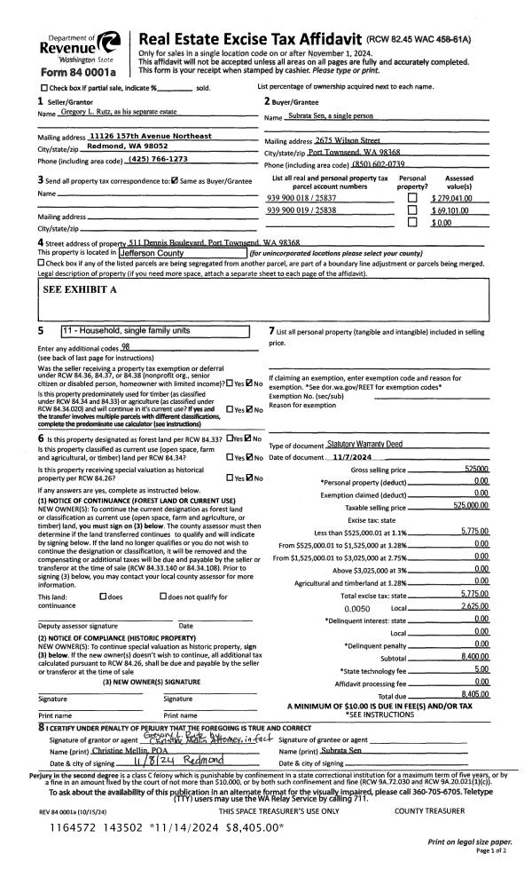 | 1 | 11/07/2024 | SWD | Statutory Warranty Deed | GREGORY L RUTZ | SUBRATA SEN | | | $525,000.00 | 143502 | |