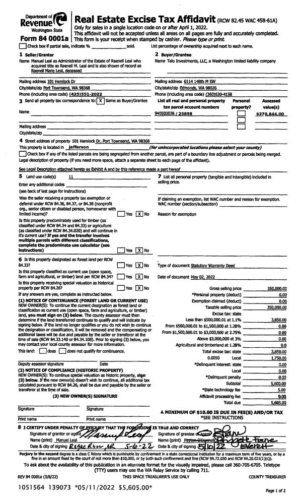 | 3 | 05/02/2022 | SWD | Statutory Warranty Deed | RAENELL M LEAL | TALO INVESTMENTS LLC | | | $350,000.00 | 139073 | |