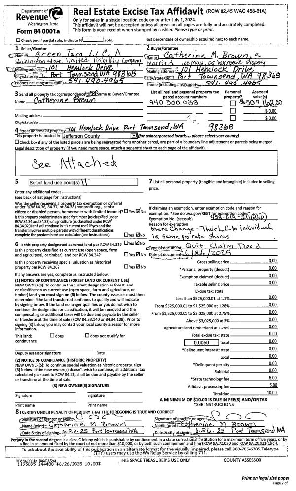 | 1 | 06/26/2025 | QCD | Quit Claim Deed | GREEN TARA LLC | CATHERINE M BROWN | | | | 144488 | |