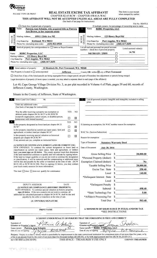 | 3 | 07/28/2016 | SWD | Statutory Warranty Deed | PATRICIA ANN SCHMITZ | RDRC LLC | | | $28,000.00 | 125995 | |