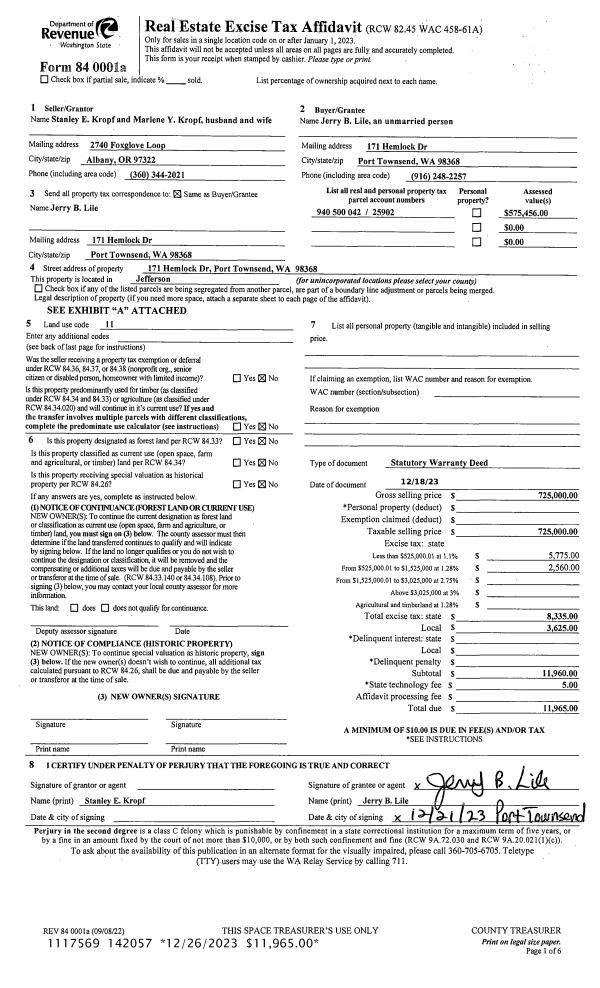 | 1 | 12/18/2023 | SWD | Statutory Warranty Deed | STANLEY E KROPF | JERRY B LILE | | | $725,000.00 | 142057 | |