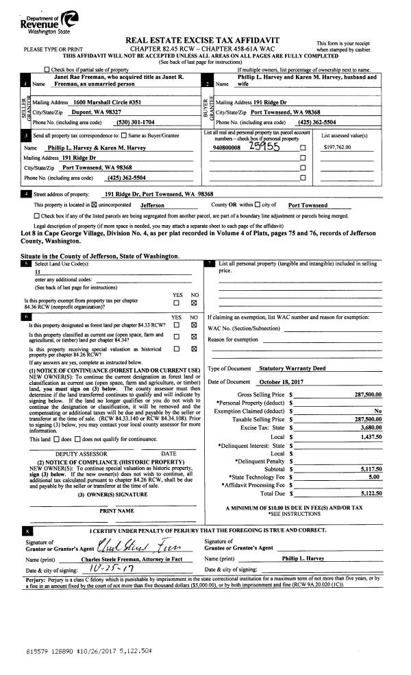 | 4 | 10/18/2017 | SWD | Statutory Warranty Deed | JANET R FREEMAN | PHILLIP L & KAREN M HARVEY | | | $287,500.00 | 128890 | |