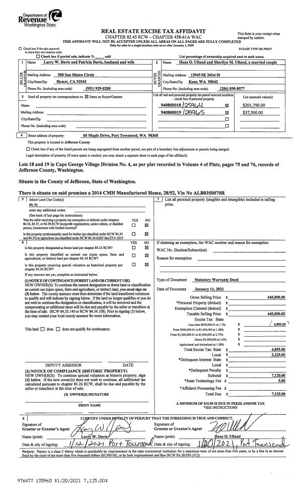 | 1 | 01/11/2021 | SWD | Statutory Warranty Deed | LARRY W & PATRICIA DAVIS | HANS & SHERILYN ULLAND | | | $445,000.00 | 135960 | |