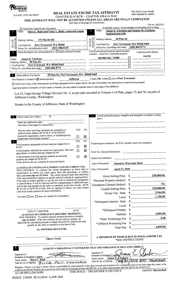 | 1 | 04/27/2018 | SWD | Statutory Warranty Deed | STEVE C & VICKY L RATH | JAMES E & JOANNE M CLARKSON | | | $230,000.00 | 130049 | |