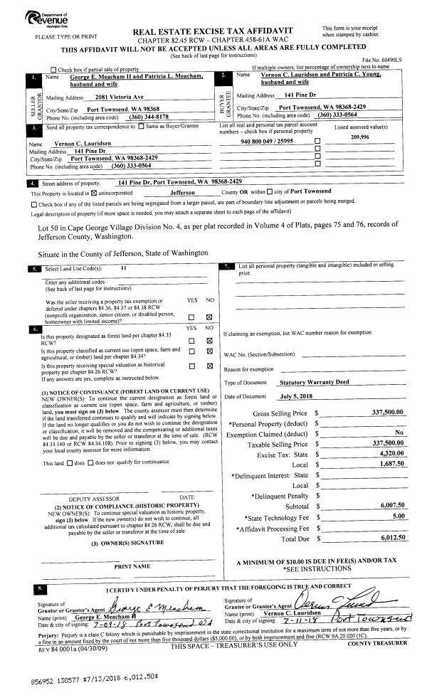| 1 | 07/05/2018 | SWD | Statutory Warranty Deed | PATRICIA L & GEORGE E MEACHAM II | VERNON LAURIDSEN & PATRICIA YOUNG | | | $337,500.00 | 130577 | |