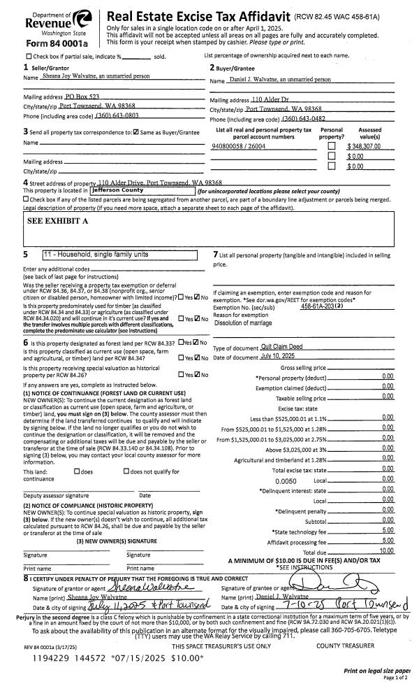 | 1 | 07/10/2025 | QCD | Quit Claim Deed | SHEANA J WALVATNE | DANIEL J WALVATNE | | | | 144572 | |
