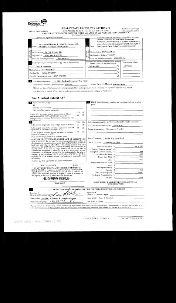 | 3 | 11/25/2015 | SPWD | Special Warranty Deed | SECRETARY OF HOUSING URBAN DEV | DIANE E MORRISON | | | $86,915.00 | 86915 | |