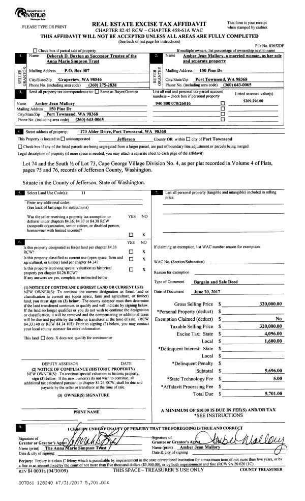 | 2 | 06/20/2017 | BSD | Bargain and Sale Deed | DEBORAH D BUXTON TRUSTEE | AMBER J MALLORY | | | $320,000.00 | 128240 | |