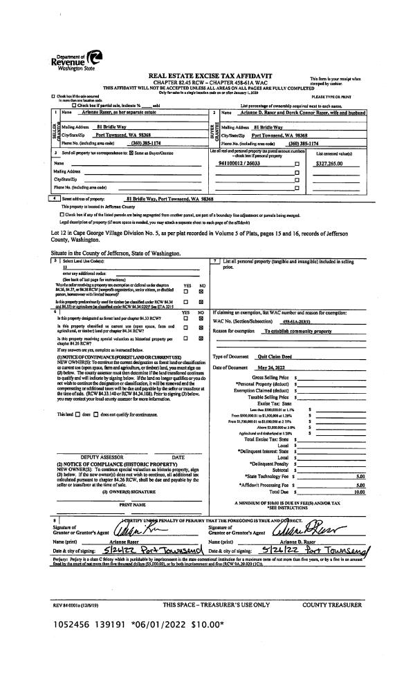 | 1 | 05/24/2022 | QCD | Quit Claim Deed | ARIANNE RASER | ARIANNE D & DEREK C RASER | | | | 139191 | |