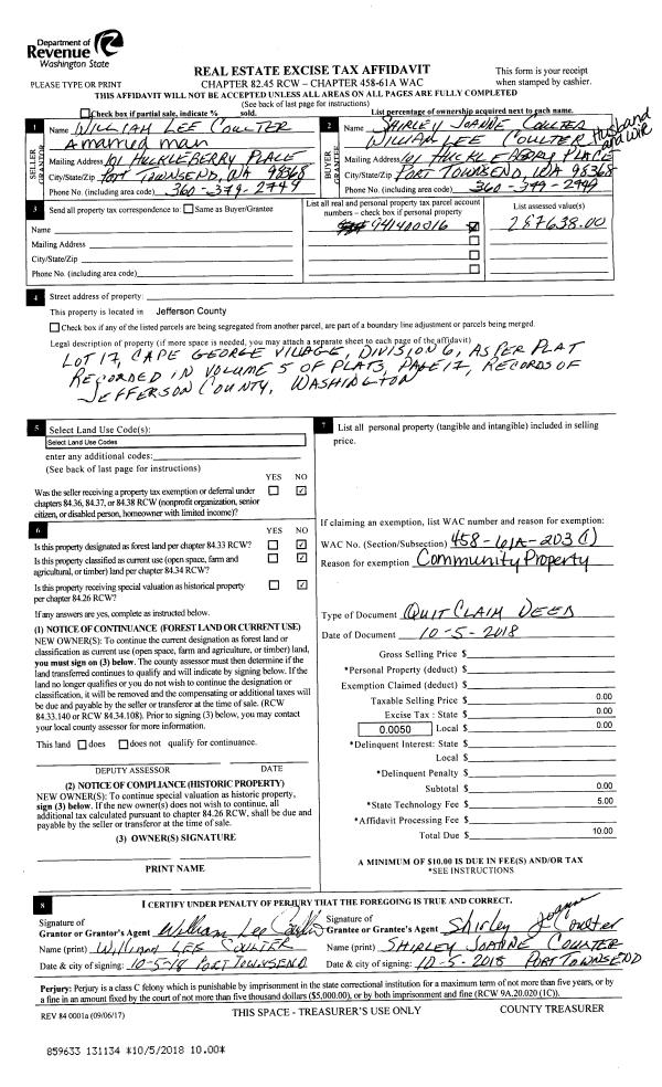 | 2 | 10/05/2018 | QCD | Quit Claim Deed | WILLIAM COULTER | WILLIAM & SHIRLEY COULTER | | | | 131134 | |
