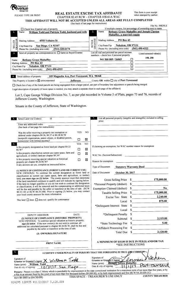 | 1 | 10/30/2017 | SWD | Statutory Warranty Deed | PATRICIA TODD | BETHANY G & JOSEPH C MAHAFFEY | | | $175,000.00 | 128935 | |