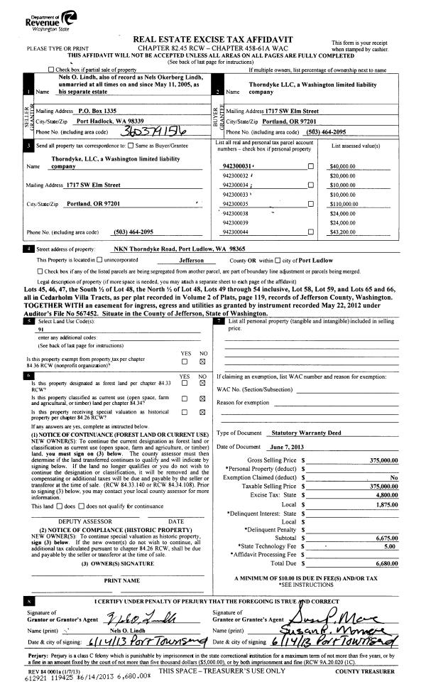 | 1 | 06/14/2013 | SWD | Statutory Warranty Deed | NELS O LINDH | THORNDYKE LLC | | | $375,000.00 | 119425 | |