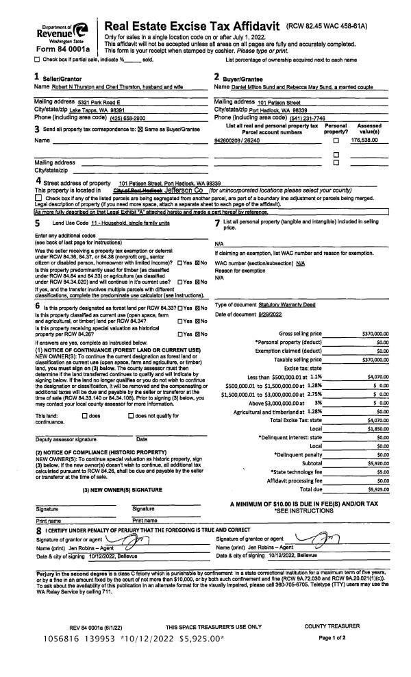 | 1 | 09/29/2022 | SWD | Statutory Warranty Deed | ROBERT N & CHERI THURSTON | DANIEL M & REBECCA M SUND | | | $370,000.00 | 139953 | |