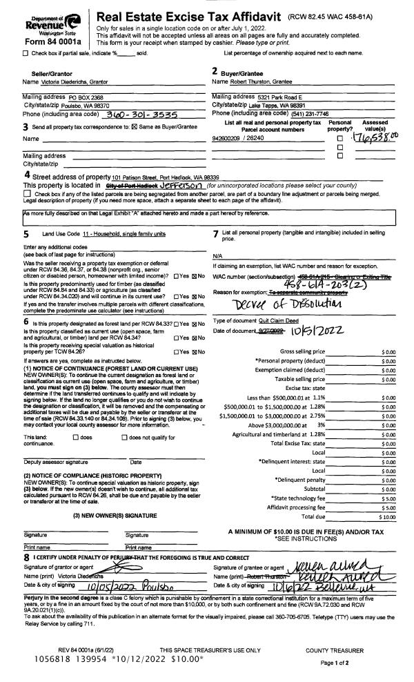 | 2 | 10/05/2022 | QCD | Quit Claim Deed | VICTORIA L DIEDERICHS | ROBERT N THURSTON | | | | 139954 | |