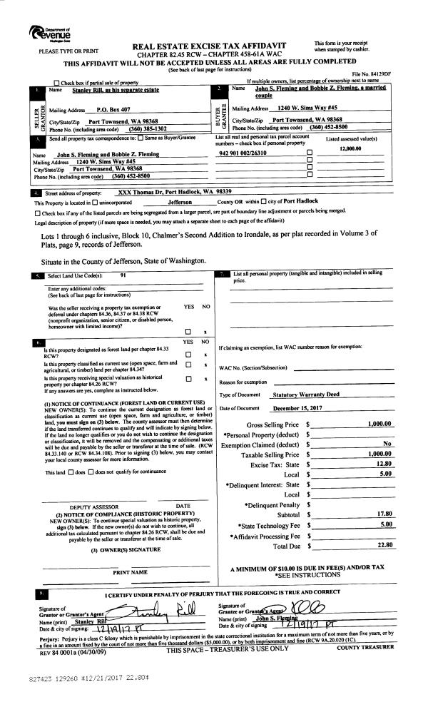 | 1 | 12/15/2017 | SWD | Statutory Warranty Deed | STANLEY RILL | JOHN S & BOBBIE Z FLEMING | | | $1,000.00 | 129260 | |