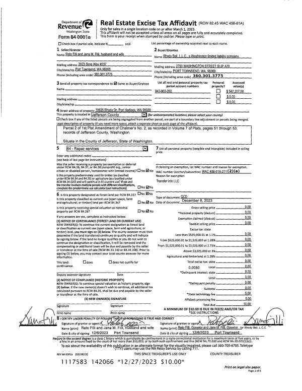 | 1 | 12/06/2023 | QCD | Quit Claim Deed | RETO FILLI | RHODY BELL LLC | | | | 142066 | |