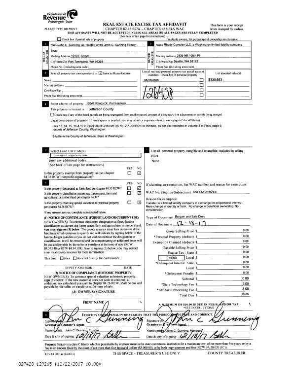 | 2 | 12/18/2017 | BSD | Bargain and Sale Deed | GUNNING TRUSTEE JOHN | RHODY COMPLEX LLC | | | | 129265 | |