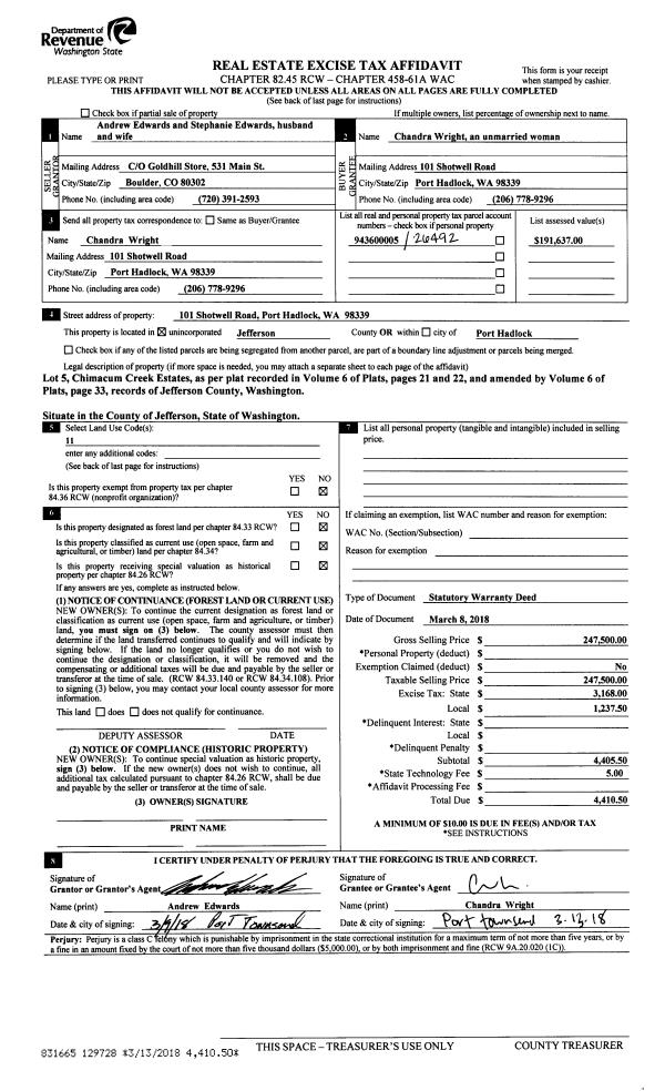 | 1 | 03/08/2018 | SWD | Statutory Warranty Deed | ANDREW & STEPHANIE EDWARDS | CHANDRA WRIGHT | | | $247,500.00 | 129728 | |