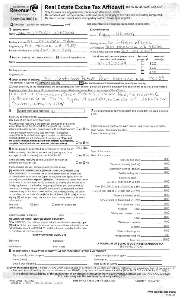 | 1 | 4218-1284S | Chimacum Creek Estates Div II Sites | 0.0000 | 0.00 | 0.00 | 0.00 | 1.00 | $110,000 | $0 |