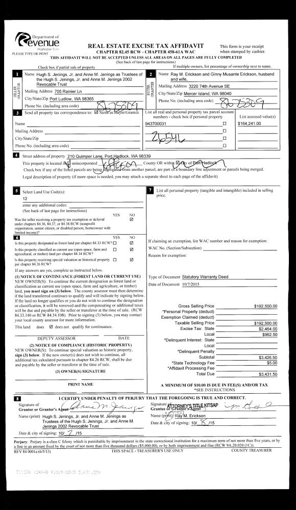 | 1 | 10/07/2015 | SWD | Statutory Warranty Deed | HUGH S JENINGS JR TRST | RAY M & GINNY ERICKSON | | | $192,500.00 | 124148 | |