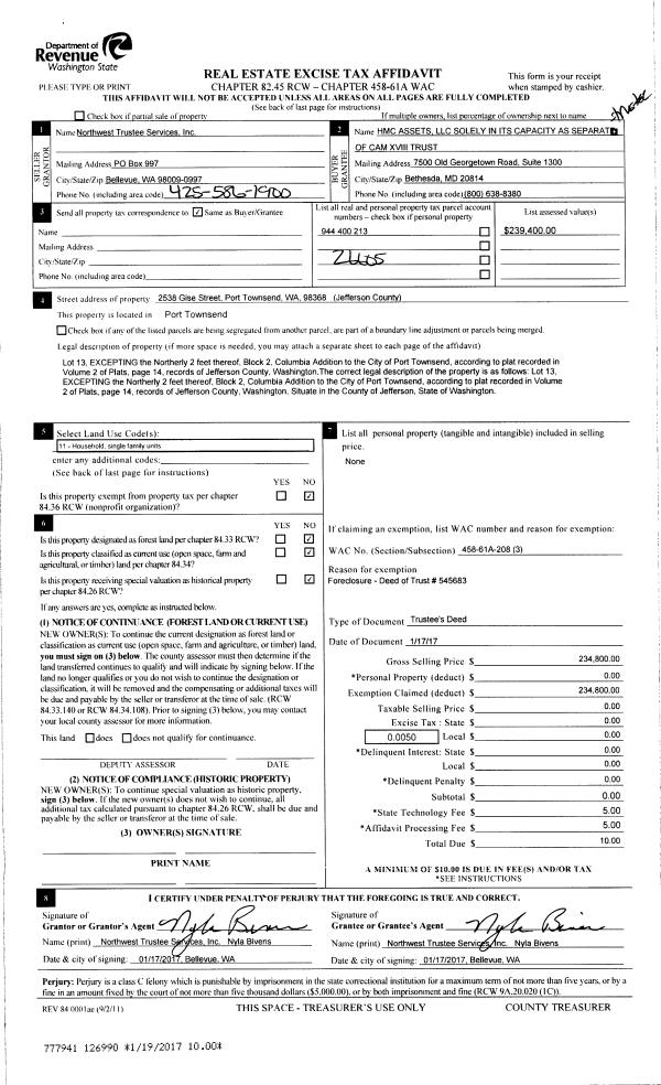 | 4 | 01/17/2017 | TRED | Trustee Deed | DENISE R FLEENER TRUSTEE | CAM XVIII TRUST | | | | 126990 | |