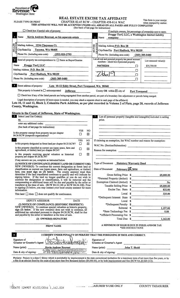 | 2 | 02/22/2016 | SWD | Statutory Warranty Deed | KEVIN A REXROAT | FROGGY TURF LLC | | | $65,000.00 | 124907 | |