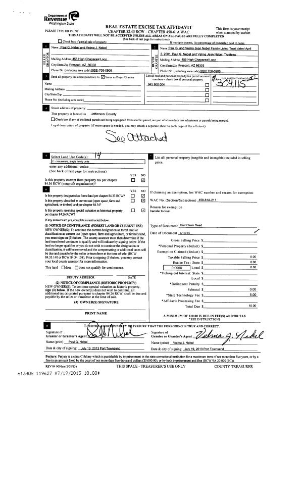 | 6 | 07/19/2013 | QCD | Quit Claim Deed | PAUL G NEBEL | PAUL & VELMA NEBEL FAMILY LIV TRUST | | | | 119627 | |