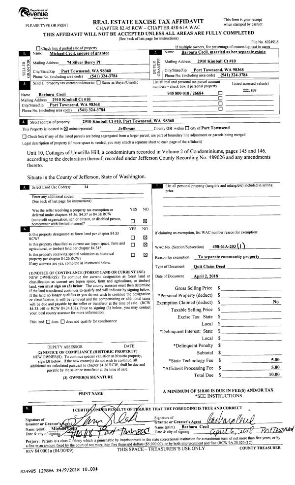 | 4 | 04/02/2018 | QCD | Quit Claim Deed | BARBARA CECIL | | | | | 129886 | |
