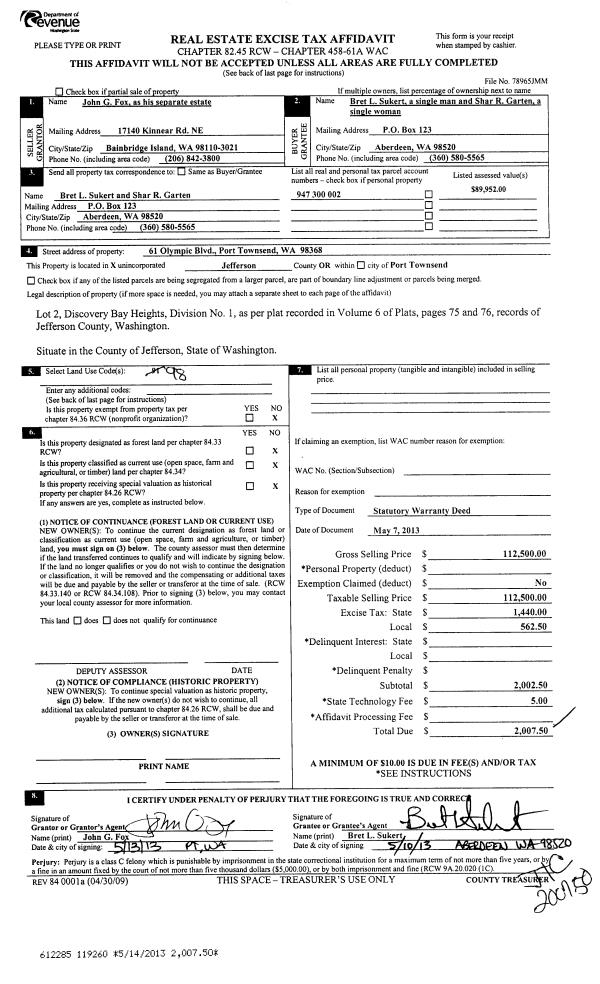 | 2 | 05/14/2013 | SWD | Statutory Warranty Deed | JOHN G FOX | BRET L SUKERT | | | $112,500.00 | 119260 | |
